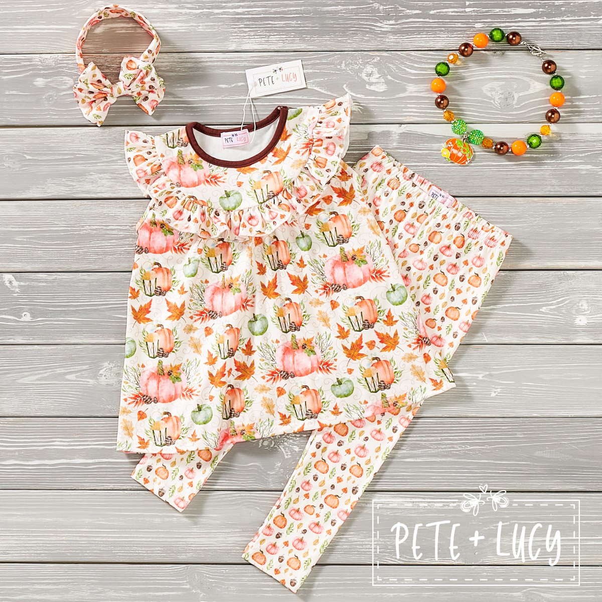 Get ready for fall with our Pumpkin Spice girls pant set! Featuring adorable pumpkins, fall greenery, and ruffle detailing, this set is perfect for the season. Stay stylish and comfortable in this playful and quirky outfit. (Pun-tastic!) Accessories not included